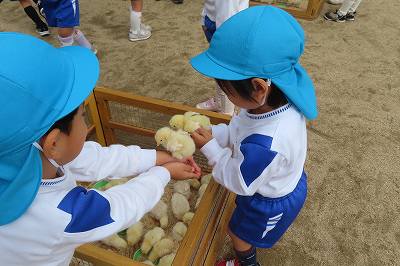 初めての体育あそびはボール運動。「ボールをしっかり胸に抱いてよ」なのにあっちでぽろ、こっちでぽろ。「まだしないよ今は見ててよ」なのにあっちでころ、こっちでころ。でも子どもたちは至って真面目に「やっているつもり」です。転がしたり、投げたり、蹴ったり、ボールに翻弄されたり・・・3年間の楽しくも厳しい(?)体育あそびの始まり始まり、です。