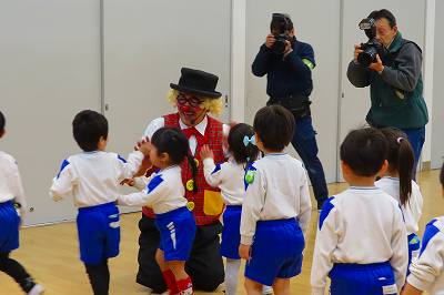 まつさんは思い出会として、ばらさんつぼみさんはお別れ会として、ピエロのトントさんの大道芸を楽しみました。スティックやコーンが宙を舞ったり、お皿がお友だちの頭の上でくるくる回ったり、「すご技」に目を丸くして、おなかを抱えて大笑いをして楽しい時間を共有しました。最後は一人ひとりタッチをしてもらいました。お部屋に帰ってからトントさんが作ってくれたイヌの風船を一人1匹もらいました。