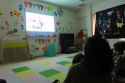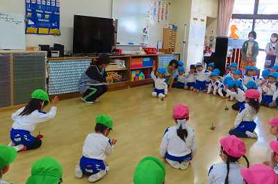 2月生まれのお友だちが待ちに待っていたお誕生日会です。前に集まったのは節分でしたが、それから劇あそび等で自信をつけぐっと成長したように見えました。今日の先生たちからのお楽しみはスライドショー「オニじゃないよ おにぎりだよ」でした。室内が暗くて写真が撮れなかったのでネイティブの先生たちとの「Hello Song」の楽し気な写真をお送りします。