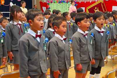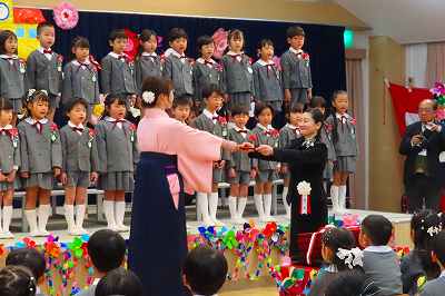 だぶだぶの制服に埋もれてあどけない顔で入園式の席に座っていた日から早3年。行事を越え、経験を積み、すっかり逞しく成長した子どもたちが幼稚園を巣立っていきました。「さようならぼくたちのようちえん」の歌詞ではありませんが、桜の花びら舞う頃はランドセルの1年生です。卒園おめでとう。