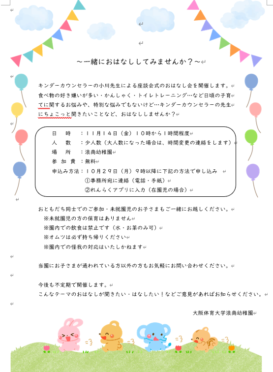 【11月14日】キンダーカウンセリング小川先生と一緒におはなししてみませんか?